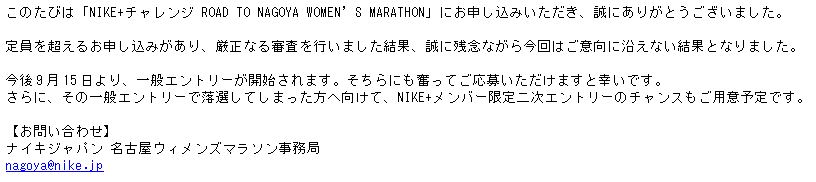 昨日の記事にも書きましたが、名古屋ウィメンズマラソンのNIKEチャレンジ枠での先行エントリー(約3,000人?)には見事落選してしまいました(T_T)