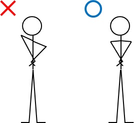 手を頭の上で組み、足は肩幅より少し小さく広げた状態から、自然に腕を体の横に下ろします。この状態が基本の立ち姿勢になります。