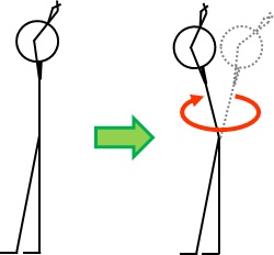腰から上を1本のまっすぐな棒にするようなイメージで動かします。腰から下は動かしません。