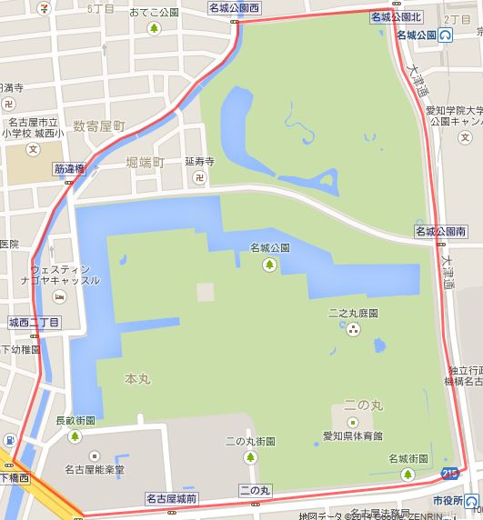 このコースだと、信号に引っかかるのは東側の「名城公園南」の交差点1か所だけ! しかも、名古屋城を見ながら走れるという思わぬ余禄もありました。