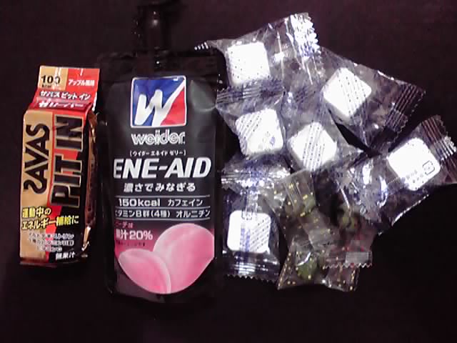 ゼリータイプの補給食、ようかんタイプの補給食が1個ずつと、ブドウ糖と塩飴を何個かずつ入れておきます。運動しない日なら十分朝ごはん代わりになる量です(^^)♪