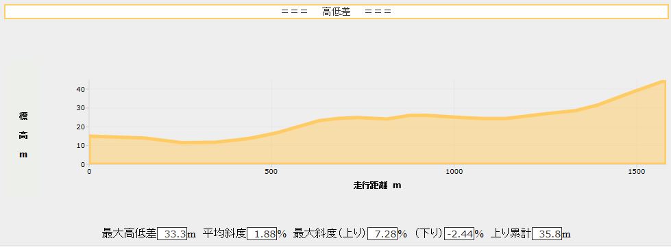 ここまでのコースの標高をジョギングシミュレータ(こちら)から見てみると、坂の勾配は最大で7パーセント以上!