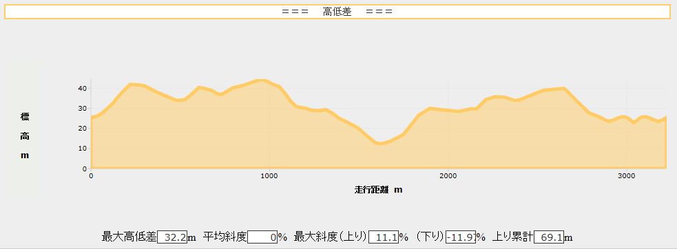 でも帰ってからジョギングシミュレータ(こちら)で今回のコースの勾配を調べてみたら、最大斜度は何と11パーセント以上、高低差は32メートルを超えていました。マジか。