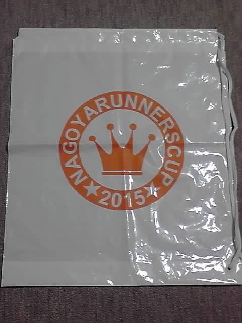 ランナーズカップのロゴ入りビニールバッグ。