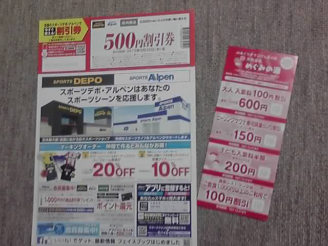 さらに、スポーツデポの500円割引券と、大府市にある天然温泉めぐみの湯の割引券がついてきました。