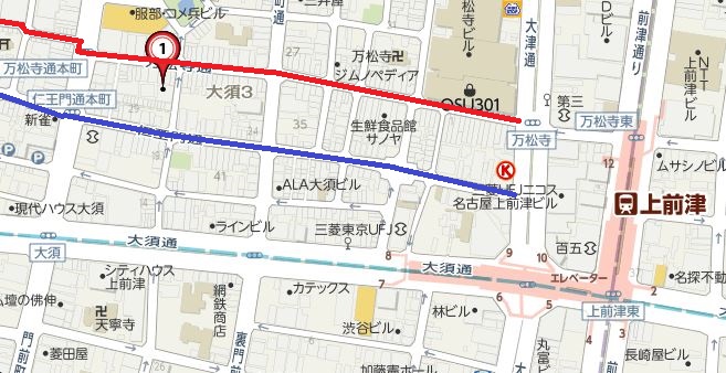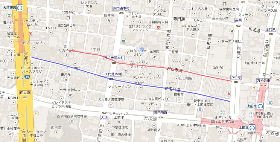 以前の記事にも書いたことがありますが、大須商店街は大須観音(地下鉄大須観音駅)と上前津駅の間に東西に広がっていて、メインとなる北側の大須観音通~万松寺通、南側の仁王門通~東仁王門通の2本の通りを、南北に走るたくさんの細い道がつないでいる感じです。