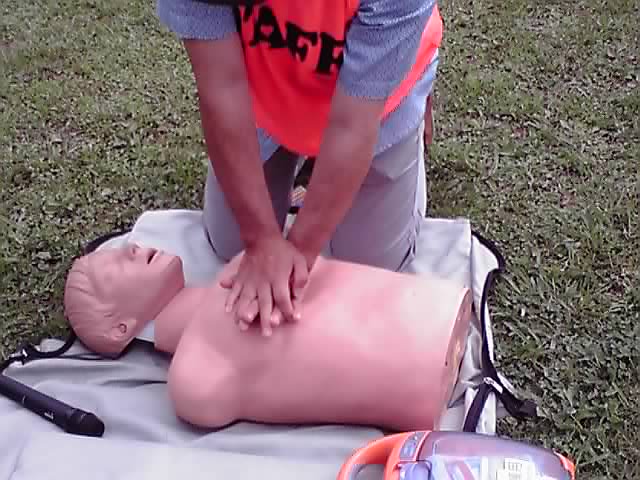 押す速さは1分間に100回ぐらいを目安に、30秒を1セットとして行います。疲れたら周りの人に代わってもらいましょう。少し実演させてもらいましたが、マジでハードですよこの動き(;゚Д゚)