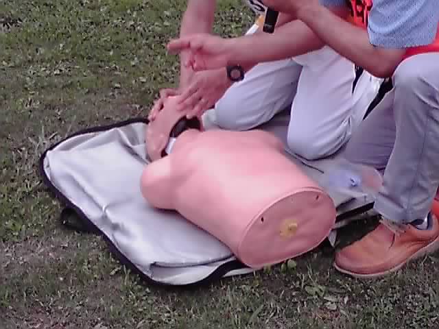 スタート前の2回のAED講習は、人体模型と練習用のダミーAEDを使って行いました。なんか怖いです(^_^;