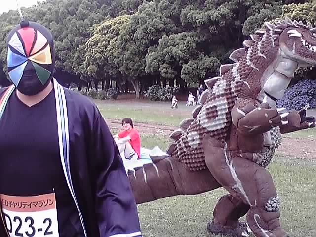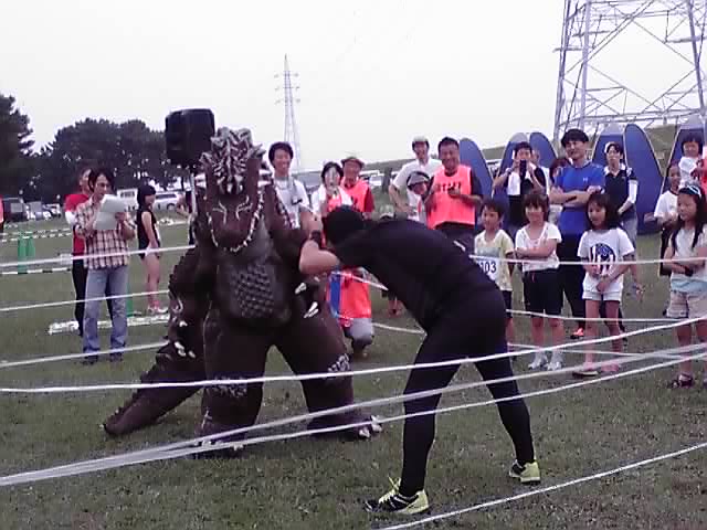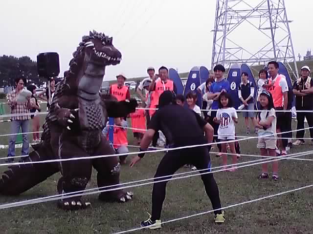 そして入場してきたのは、謎のマスクマンとゴジラみたいな怪獣でした。