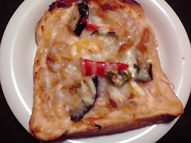 ピザ200円。カリカリのトーストの上に、具はナス、玉ねぎ、ビーマン、パプリカなど野菜たっぷり♪