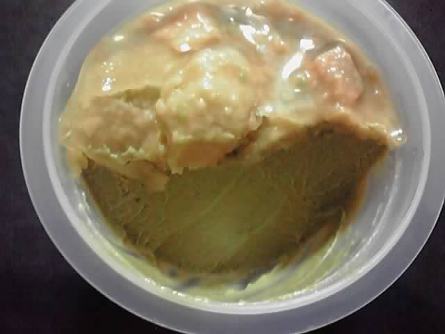 汚くて恐縮ですが、これが断面です。とろりとした抹茶味のプリンの上に、アボカドの果肉がゴロゴロ入ったゼリーがのっています。すごい色や(;´Д`)