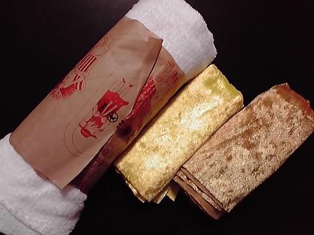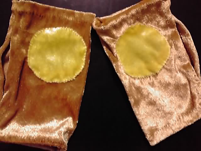 手袋はこんな感じ。茶色の生地を親指を通す部分だけ残して筒状に縫い、手のひらに肉球に見立てた黄色の生地を縫い付けただけのだだくさ(=いい加減)な造りですが…