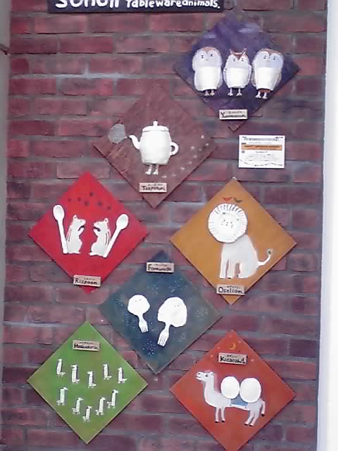 食器屋さん「Sono」の壁には、湯のミミズク、リスプーン、フォークラゲ、はし置キリンなど、食器とカトラリーをテーマにした作品も!