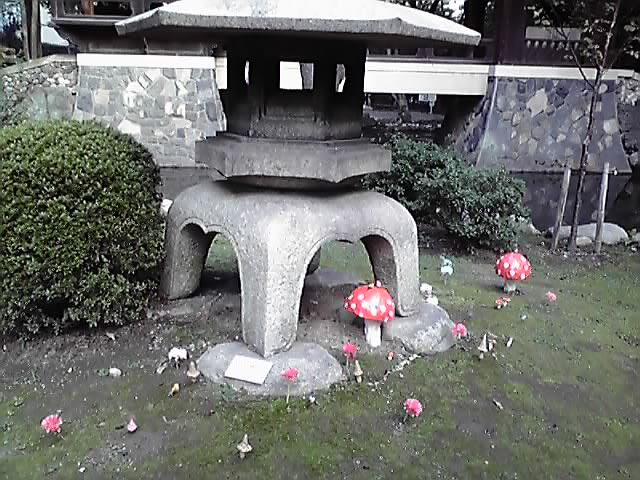 実際にはこのキノコなどはまだ可愛い方で、もっとトゲトゲギラギラした金属製のオブジェも飾ってありました。作品そのものはいい出来だと思いますが、閑静な日本庭園の中だと京都タワー並みに悪目立ちしています。