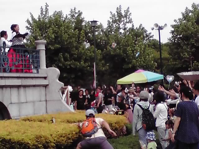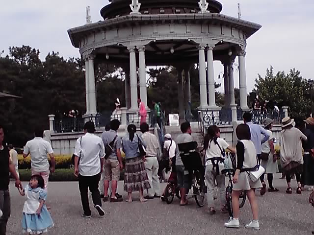 実は結婚式を挙げたのは全部で3組いらしたようで、同じ奏楽堂の別の方角にもお菓子を撒く新郎新婦がいらっしゃいました。うまく撮れませんでしたが、こちらの方々は「不思議の国のアリス」モチーフの衣装のようです。