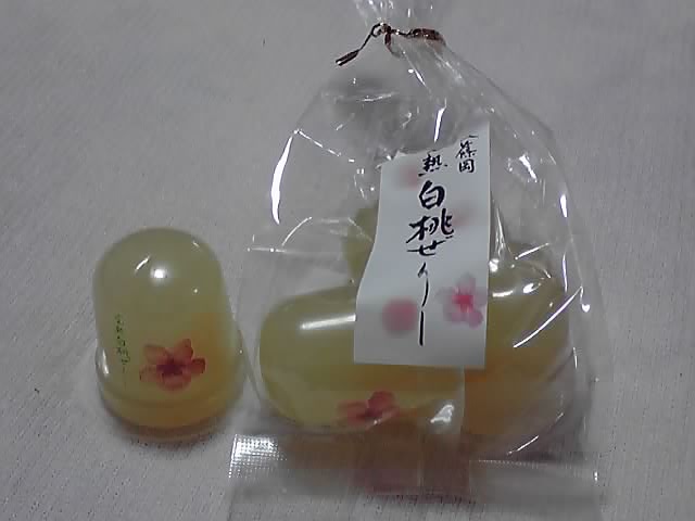完熟白桃ゼリー。写真はプチゼリー5個入り594円です。小牧市篠岡の甘い桃をふんだんに使い、舌触りも果肉のような濃厚で贅沢な味わい! 半分ぐらい凍らせて食べるのもおススメですよ♪