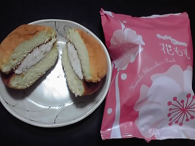 桃のブッセ「花もも」173円。果肉入りの甘酸っぱい生クリームはやや硬めのどっしりした舌触りで、ふわふわしたブッセとの相性抜群!