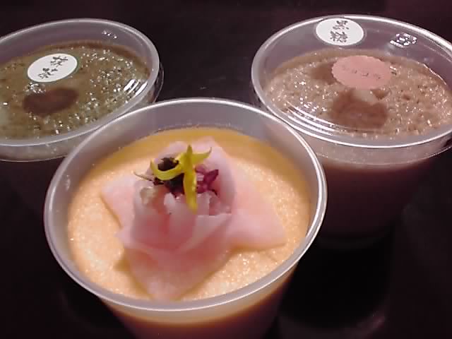 今回買ったのは抹茶味、黒糖ショコラ味、それに催事限定の求肥&バジルペースト&エディブルフラワー(食べられるお花)のトッピング付きプリン!