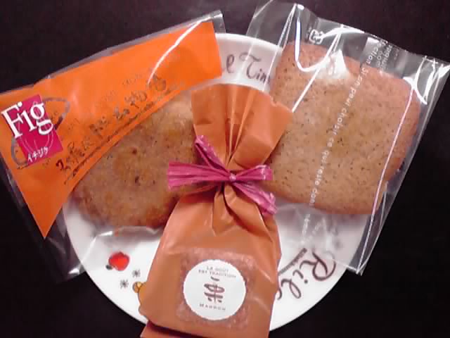 花形のいちじく&ヘーゼルナッツ140円、四角いフリアン130円、紙に包まれているむし栗160円。