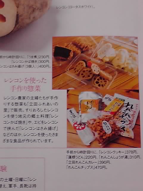 こちらは、「立田ふれあいの里」で売っているレンコン商品。上のレンコンのおそうざいは分かりますが、下の写真のレンコンカレー、レンコンうどん、レンコンしょうが湯、レンコンクッキーとは一体…