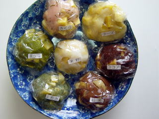 こちらは、前述のサイトさんからお借りしてきた写真です。このお皿に乗っているのは、ごらんの通りすべて鬼まんじゅうですが、すべて変わりフレーバーです。
