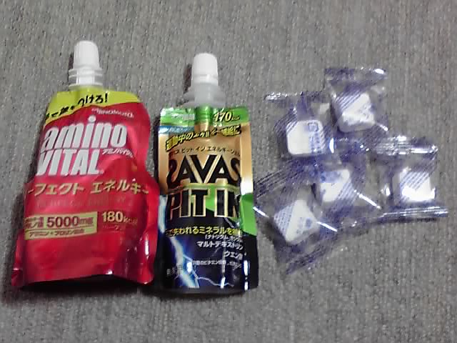 スタート前に食べる大きめゼリーが1個と、途中で食べる小さめゼリーが最低1個、それにブドウ糖を何個か持って行きます。
