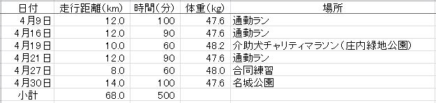 3月8日の名古屋ウィメンズマラソンが終わってから、参加したマラソン大会は4月19日に庄内緑地公園で開催された介助犬チャリティマラソン1回だけ。