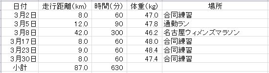 しかし、3月の走行記録を集計したら悲惨な結果になりました orz 名古屋ウィメンズで42.195キロを走ったにも関わらず、合計してたったの87キロ…