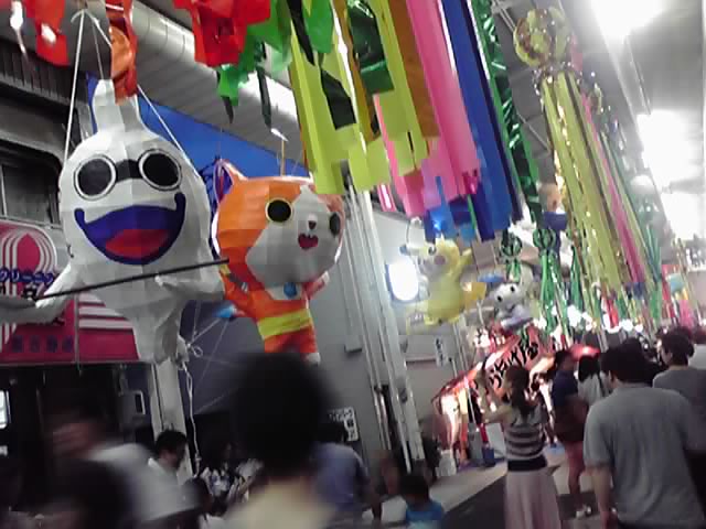 このお祭りは、毎年いろんなアニメキャラクター等のハリボテがアーケードから吊り下げられ妍を競っている(誤用)ことで有名です。