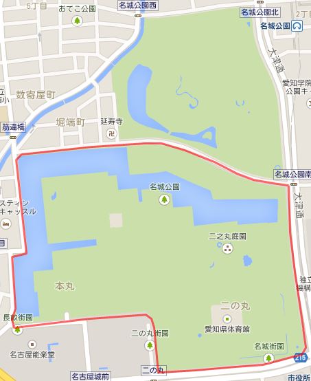 ていうかこれ、この前発見した信号待ちのほとんどないコースの南半分ですね! 1周約2.8km、ライトアップされた名古屋城もバッチリ見えて、しかも1回も信号がないという、確かにこちらのコースの方がいろいろな点で優れていると思います。