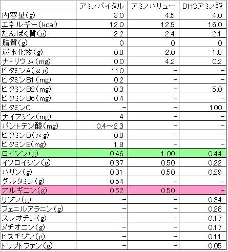このロイシンとアルギニンは、市販のアミノ酸サプリメントによく含まれているようですので、実際にはどれぐらい含まれているのかちょっと比較してみました。といっても私が今までに飲んだことがあるのは、