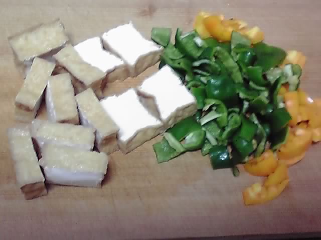 ①湯通しした厚揚げと、適当な野菜(ナス・ピーマン・キャベツ・ニンジンなど)を食べやすいサイズに切ります。
