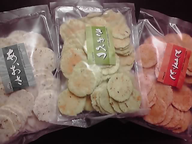 蒲郡市の石黒商店から出品の、3袋1000円のおせんべい。左から順にあおさ・キャベツ・トマト! 特に右2つが珍しい!