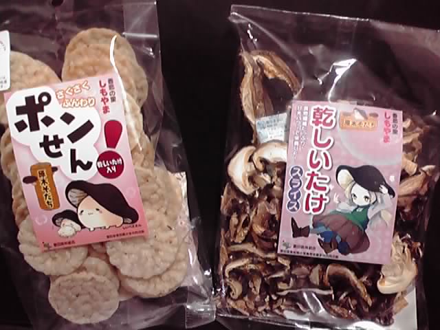 豊田市から出品、豊田森林組合の干ししいたけスライス、50グラム500円と、しいたけ味のポンせん270円。