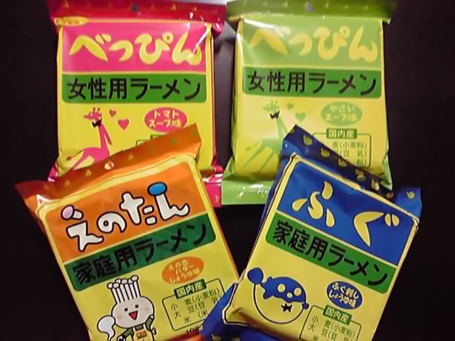 上の写真はふぐ刺ししょうゆ味、えのきバターしょうゆ味、女性用ラーメントマトスープ味、女性用ラーメン野菜スープ味です。