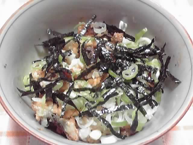 2. 本当ならおひつにごはんを入れて、食べる時用のお茶碗は別に用意しますが、家で食べるので略式で…どんぶりご飯の上に、細切りにしてたれを付けたかば焼きを並べます。