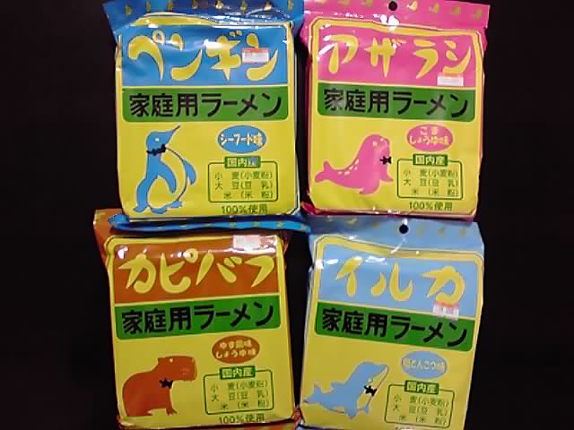 前回、あいちの農林水産フェア&ドンキホーテ名古屋本店では女性用べっぴんラーメン(やさいスープ・トマトスープ)、ふぐ刺ししょうゆ味、えのきバターしょうゆ味、でらうみゃーしお味の5種類を試しましたが、今回買っておいたのはイルカ、アザラシ、ペンギン、カピバラの4種類。