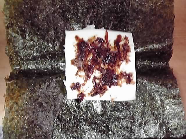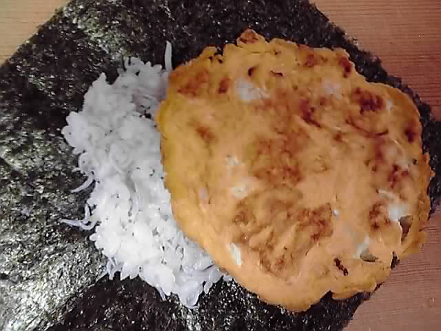お茶碗に軽く1杯分作ったじゃこご飯の半分をのりの上に広げ、その上に卵焼きを乗せたところです。ちょっと卵焼きが大きかった?