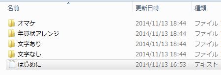 写真を選んだあと、クリエーターズマーケットで買った年賀状作成ソフトを読み込みます。ファイルの中身はこんな感じで、文字あり・文字なし合わせて15枚の年賀状データが入っていて500円! お得や(*^^*)