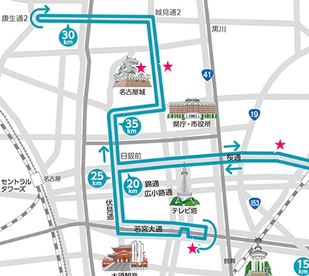 最後が約38キロ地点、桜通の小川交差点付近。